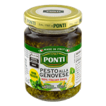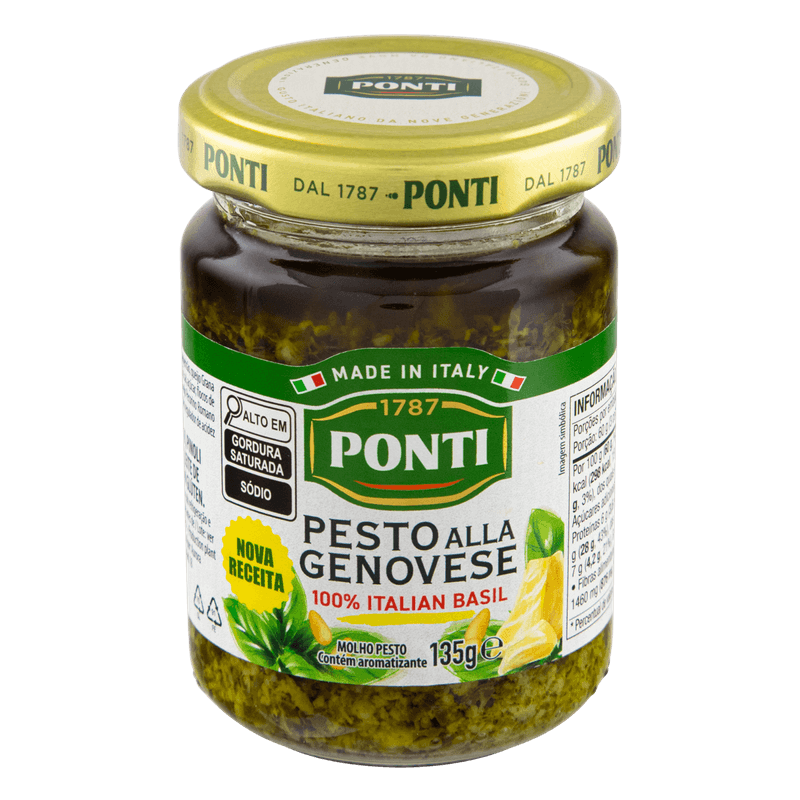 Pesto alla Genovese é um tradicional molho italiano feito com matérias-primas frescas e selecionadas de manjericão, normalmente servido com massas. O Pesto Ponti possui uma linda cor verde e intenso sabor de manjericão. O manjericão é misturado com azeite, queijo, castanha de caju e especiarias.
